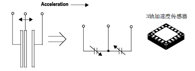 目前的加速度傳感器有多種實現方式,主要可分為壓電式、電容式及熱感應式三種,這三種技術各有其優缺點。以電容式3軸加速度計的技術原理為例。電容式加速度計能夠感測不同方向的加速度或振動等運動狀況。其主要為利用硅的機械性質設計出的可移動機構:由于加速度使得機械懸臂與兩個電極之間的距離發生變化,從而改變了兩個電容的參數。通過集成的開關電容放大電路量測電容參數的變化,形成了與加速度成正比的電壓輸出。因此3軸加速度傳感器必然包含一個單純的機械性MEMS傳感器和一枚ASIC接口芯片兩部分,前者內部有成群移動的電子,主要測量XY及Z軸的區域,后者則將電容值的變化轉換為電壓輸出。