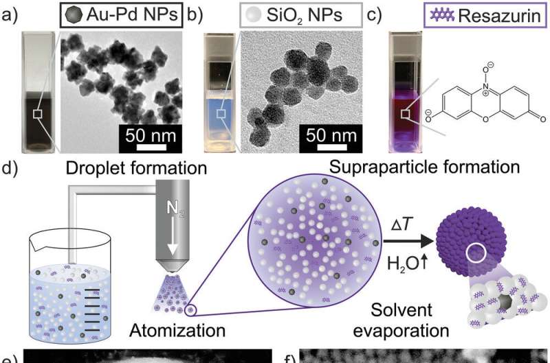 H 2指示劑 SP 的構建模塊、制造和形態表征:a) Au-Pd NP 和 b) SiO 2 NP 分散體的數碼照片和 TEM 顯微照片;c) 刃天青染料水溶液的數碼照片;d) 通過液滴蒸發(使用噴霧干燥作為工具)將 SP 制造成自由流動的紫色粉末的示意圖;e) SP 和 f) 其表面的 SEM 顯微照片。來源:先進功能材料(2022)。DOI: 10.1002/adfm.202112379