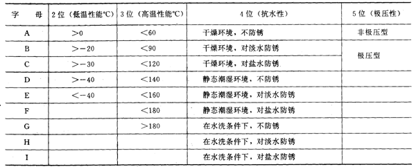 第1個字母代表潤滑脂;第2~5個字母的含義如表1所示。