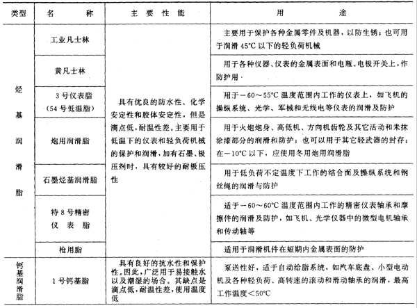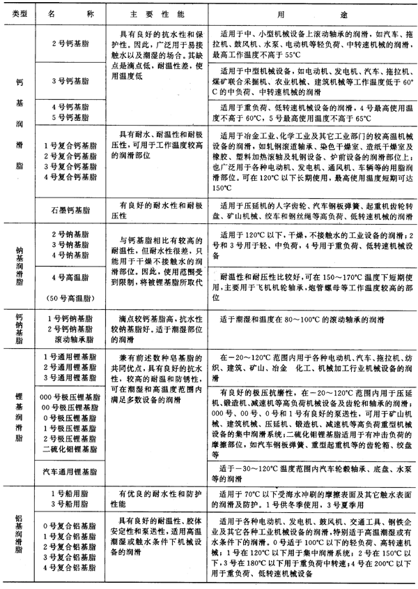 礦油類潤滑脂品種較多,目前廣泛使用的主要品種、性能及用途見表10。其中,鋰基潤滑脂幾乎兼?zhèn)淦渌砘膬?yōu)點,在多數(shù)場合下都可取代其它皂基脂,是國內(nèi)推廣應(yīng)用的新品種。