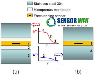 近日,中國科學院工程熱物理研究所傳熱傳質研究中心科研人員針對這一微尺度熱物性測量難題進行了較深入研究。科研人員提出了一種自適應基于獨立型傳感器的3ω技術(圖1、圖2),通過分別測試5層對稱結構(基底-微孔膜-傳感器-微孔膜-基底)及作為對照組的3層對稱結構(基底-傳感器-基底)的獨立型傳感器的溫度響應信號(圖1),結合提出的數學模型,可以較為準確地得到數十微米厚微孔膜的有效熱導率。