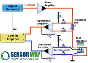圖2 用于微孔膜測量的自適應基于獨立型傳感器的3ω系統,包含:信號發生器、鎖相放大器、前置放大器、運算模塊(運放、低溫漂電阻)及計算機自動控制系統。