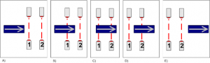 圖1.運動方向傳感器的原理:A)待機–對象從左側(cè)接近傳感器,B)傳感器“ 1”處于活動狀態(tài),C)傳感器“ 1”和“ 2”處于活動狀態(tài),D)傳感器“ 2”處于活動狀態(tài), C)待機模式