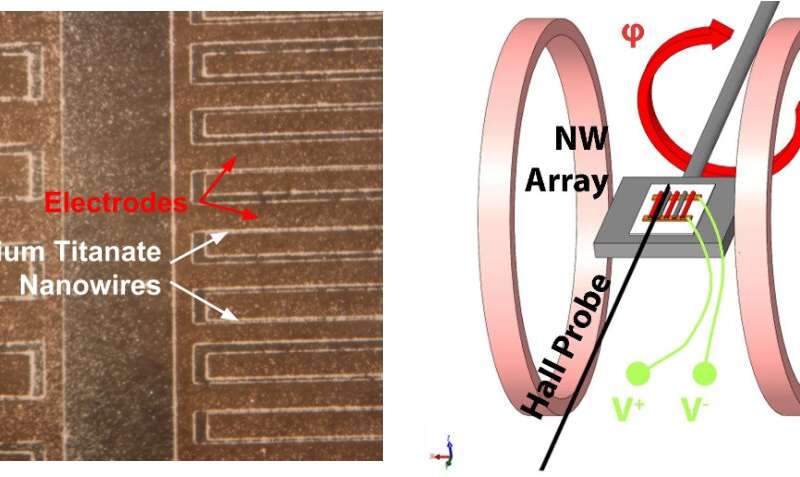 每條納米線由兩半組成-鈦酸鋇具有壓電特性,并與磁致伸縮材料鈷鐵氧體配對。在磁場的存在下,例如在汽車發動機的鋼齒輪中存在的磁場,鈷鐵氧體會發生形狀變化,從而使壓電鈦酸鋇產生應變,從而引起電極化。通過將納米線陣列連接到數據收集源,磁電產生的電脈沖可用于感測發動機正時或通過輪速檢測打滑。功能性磁場傳感器是通過并聯連接許多納米線形成的。