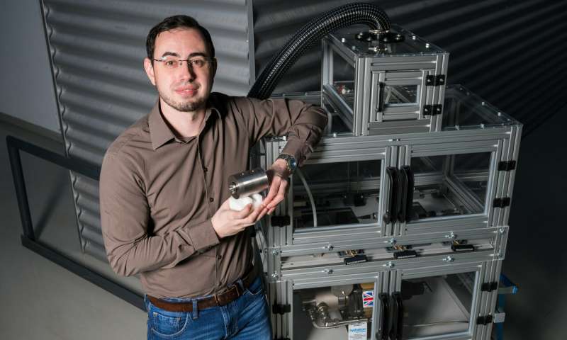 工程學(xué)畢業(yè)生Marco Schott是Schütze教授團(tuán)隊(duì)的博士生,他正在研究氫氣測(cè)量池,并配備了高壓測(cè)試裝置,該裝置將在漢諾威工業(yè)博覽會(huì)上展出。圖片來(lái)源:Oliver Dietze