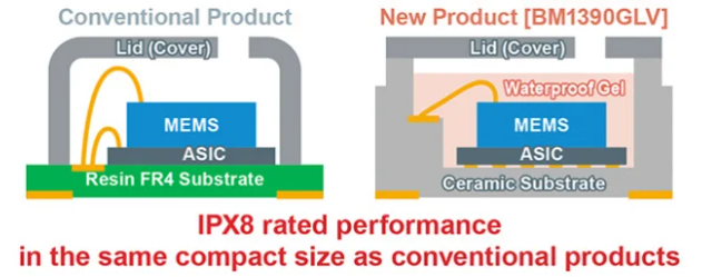 BM1390GLV 中采用的 MEMS 和控制電路可能與其他類似產品沒有太大區別;然而,新傳感器采用專有結構和特殊的防水凝膠,使其適用于需要防水性能的工業設備和家用電器。