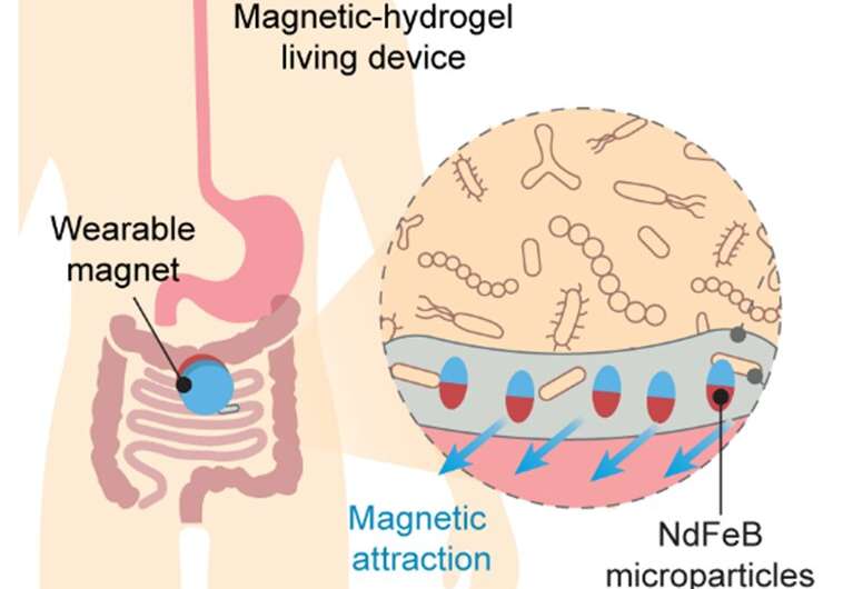 示意圖說明使用封裝在磁性水凝膠裝置中的活傳感器用于腸道研究。圖片來源:Xinyue Liu 等