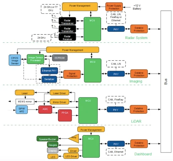 高級駕駛員輔助系統(tǒng)的示例框圖。圖片由Avnet 提供
