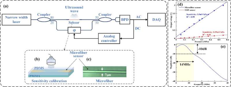 鑒于較大的倏逝場(chǎng),研究人員將超細(xì)纖維的直徑優(yōu)化為 7μm。如圖1b所示,通過使用具有高彈性光學(xué)系數(shù)的聚二甲基硅氧烷(PDMS)材料來封裝微纖維,進(jìn)一步提高了傳感器的靈敏度。當(dāng)超聲波作用在傳感器上時(shí),由于彈性光學(xué)效應(yīng),PDMS的折射率會(huì)發(fā)生相應(yīng)的變化,從而導(dǎo)致微纖維的有效折射率發(fā)生調(diào)制。構(gòu)建了一個(gè)馬赫-曾德爾干涉儀來解調(diào)由入射超聲波引起的詢問激光的相位變化. 基于比例積分微分(PID)方法的反饋穩(wěn)定器用于補(bǔ)償由噪聲引起的低頻波動(dòng)。實(shí)驗(yàn)結(jié)果表明,與標(biāo)準(zhǔn)單模光纖傳感器相比,線性超細(xì)纖維超聲傳感器的靈敏度提高了一個(gè)數(shù)量級(jí)。該傳感器具有 153Pa 的低噪聲等效壓力和高達(dá) 14MHz (-10dB) 的寬響應(yīng)帶寬。此外,該傳感器可用于微弱信號(hào)的檢測(cè),通過優(yōu)化超細(xì)纖維和檢測(cè)系統(tǒng),提高傳感器的靈敏度和帶寬。