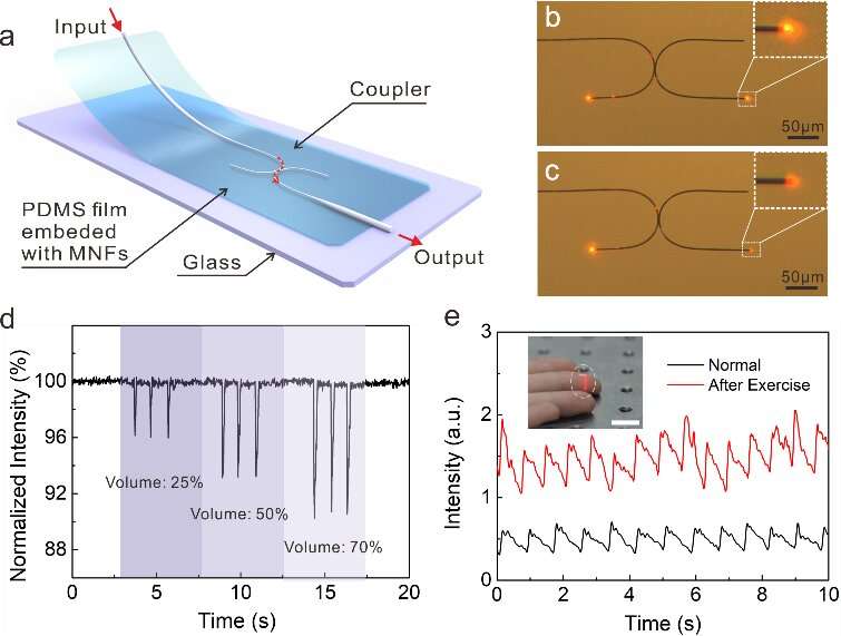 基于MNF耦合器的應(yīng)變傳感器工作原理 (a) 應(yīng)變傳感器結(jié)構(gòu)示意圖。(b), (c) MNF 耦合器在間隙略微變化之前和之后的光學顯微照片,分別。MNF的直徑約為900nm,彎曲半徑為50μm。(d) 設(shè)備對三種不同音量的節(jié)拍器的響應(yīng)。(e) 在正常情況下(每分鐘 72 次)和運動后(每分鐘 85 次)測量實時指尖脈搏波。插圖顯示了傳感器連接到指尖以測試指尖脈搏的照片,比例尺為 1 厘米。圖片來源:Compuscript Ltd