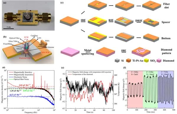 小型化、集成化、便攜化是鉆石量子傳感器取得實際應用的重要條件。該團隊基于晶圓級微機電工藝平臺,利用標準微納加工技術,制備出鉆石量子磁傳感器的核心——鉆石芯片。芯片內部集成了微波輻射結構,實現了原位微波量子態操控。研究采用金屬熱壓鍵合技術,實現了鉆石單晶與硅晶圓的異質集成,確保了機械穩定性。鉆石芯片耦合帶有梯度變化折射率透鏡的光纖模塊,實現了“光進光出”的工作模式,縮小了探頭尺寸,實現了鉆石磁強計探頭的高集成度。研究進一步表明,采用雙頻共振技術可以同時進行磁場和溫度場的同步實時測量,不僅通過溫漂限制提高了磁場測量的信噪比,而且確保了傳感器的溫度穩定性。