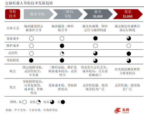 磁條導航與二維碼導航,具有維護成本高,路線固定導致靈活性相對較差的特點。視覺SLAM相對激光SLAM的技術成熟度較低,且對光線的依賴度較高,并且算法量大也是行業難點。