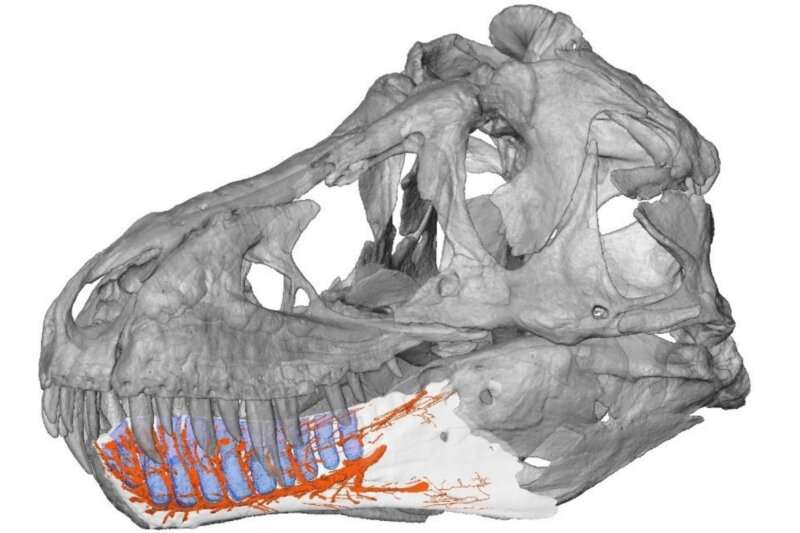 雖然已經(jīng)在幾種化石爬行動物中分析了頜骨血管和神經(jīng)的形態(tài),但這項研究是對霸王龍下頜骨內(nèi)部結(jié)構(gòu)的研究。