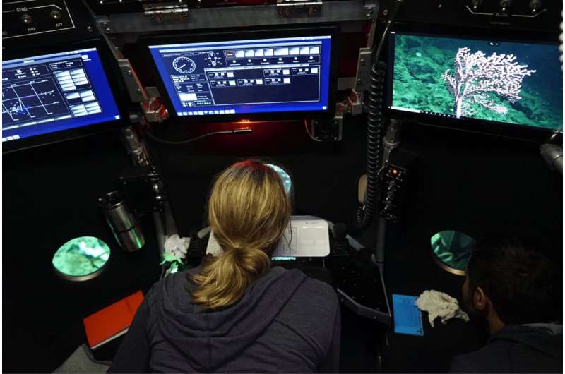 WHOI 科學家 Colleen Hansel 在 HOV Alvin 內部。圖片來源:伍茲霍爾海洋研究所)