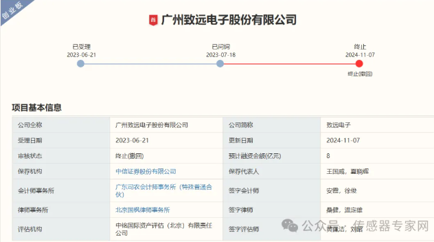 隨著經濟環境的變化和金融政策的收窄,2024年以來,已有多家傳感器企業IPO終止。 11月7日,深圳證券交易所公告顯示,又有一家中國傳感產業鏈知名企業——廣州致遠電子股份有限公司(下文簡稱“致遠電子”)IPO終止。 從上市信息看,致遠電子于2023年6月21日向深交所提交IPO申請獲受理,2023年7月18日獲問詢,并于2024年11月7日終止IPO審核,終止原因為“廣州致遠電子股份有限公司、保薦人撤回發行上市申請”。本次致遠電子IPO的保薦機構